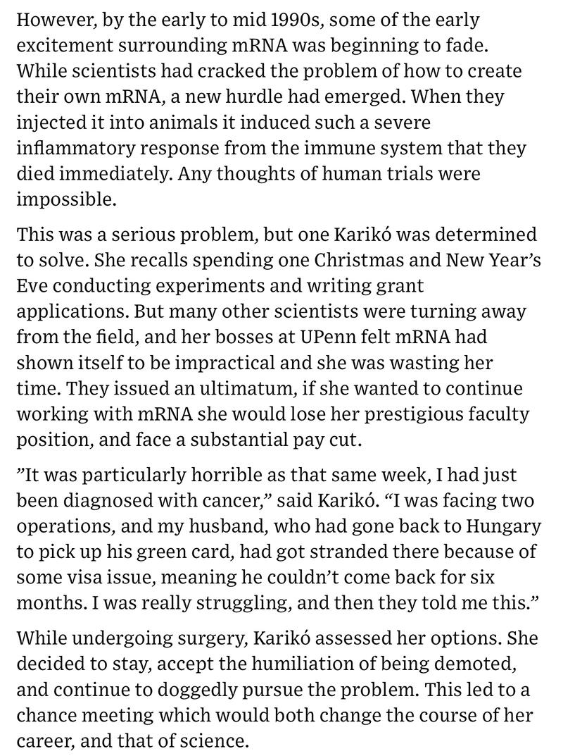 The story of how mRNA vaccines are made possible by one scientist’s (Katalin Karikó) perseverance.
