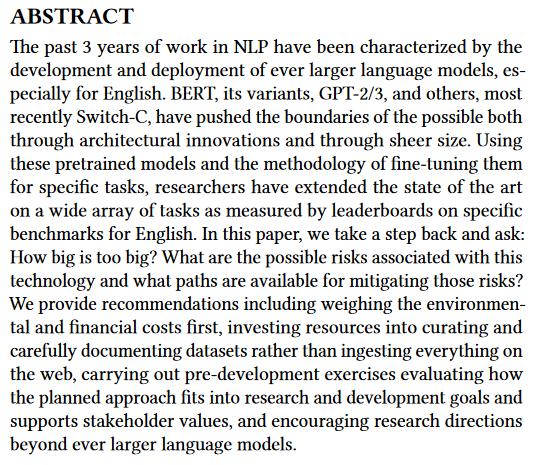 On the Dangers of Stochastic Parrots: Can Language Models Be Too Big? http://faculty.washington.edu/ebender/papers/Stochastic_Parrots.pdf
