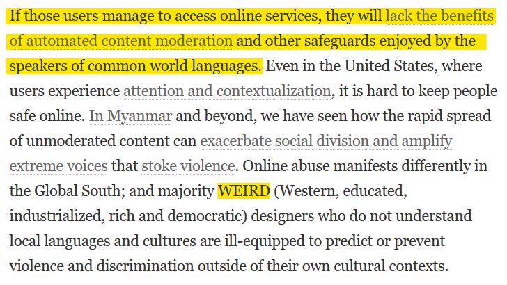 Interesting argument that wider language coverage can help mitigate the spread of extremist voices. Also, a cool acronym WEIRD. :-)