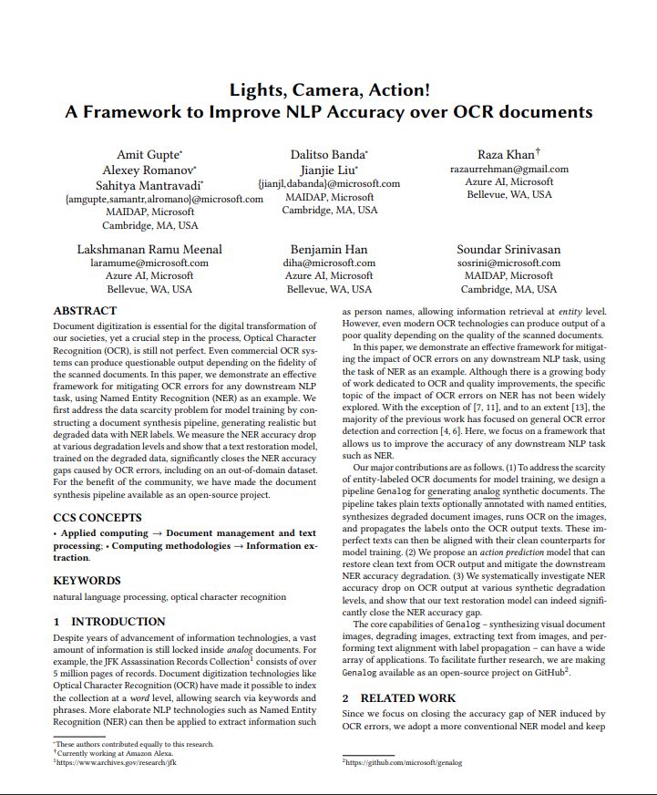 Lights, Camera, Action! A Framework to Improve NLP Accuracy over OCR documents. Document Intelligence Workshop @ KDD 2021: https://document-intelligence.github.io/DI-2021/files/di-2021_final_22.pdf
