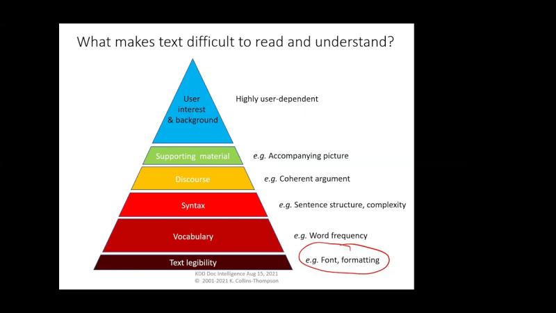 Recording of invited talk 2/6 in Document Intelligence Workshop @ KDD2021 given by Kevyn Collins-Thompson, Associate Professor of Information and Computer Science at University of Michigan.