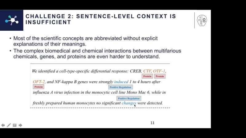 Abstract: Like many scientific fields, new chemistry literature has grown at a staggering pace, with tens of thousands of papers released every month. In our newly created U.S. NSF AI Institute on Molecular Synthesis, we are applying knowledge extraction techniques to automatically construct knowledge bases from scientific literature. The constructed knowledge bases include chemical entities and reactions between entities, and thus they can be used to predict chemical reactions, products, and properties, such as yield, toxicity, and water solubility, for creating new molecules and improving manufacture of target molecules. However, existing information extraction techniques developed for news domain or even biomedical literature will not be directly effective for chemistry literature. One reason is that chemical entities are often complex formula-like names (e.g., 5,6-dihydroxycyclohexa-1,3-diene-1-carboxylic acid). Moreover, many chemicals simply have never been coined with any nomenclature in natural language. Therefore the chemical entity mentions are essentially rare terms that cannot be learned well by only language model. In pursuit of this goal, we propose a novel multimodal embedding approach for constructing a shared common semantic space among multiple data modalities: (1) 2-D images of molecules, representing the underlying molecules or reactions; (2) text-based molecule descriptors; (3) chemical graph structure; (4) natural language definition and description; and (5) structured properties in external databases. I will then present the applications of this common semantic space in building an end-to-end knowledge extraction system for chemistry literature, and using the constructed knowledge base for cross-modal chemical entity retrieval with natural language, and molecule descriptor string generation from molecular diagram images. I’ll present a new benchmark that includes 81 million molecules and 100 chemistry papers fully annotated with a new fine-grained Chemistry ontology. I’ll also talk about remaining challenges and ongoing work on representing chemical reactions.