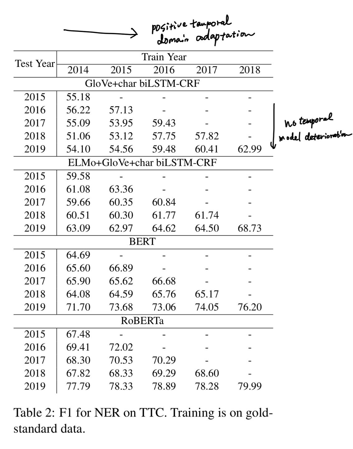 Abstract: Keeping the performance of language technologies optimal as time passes is of great practical interest. Here we survey prior work concerned with the effect of time on system performance, establishing more nuanced terminology for discussing the topic and proper experimental design to support solid conclusions about the observed phenomena. We present a set of experiments with systems powered by large neural pretrained representations for English to demonstrate that {} is not as big a concern, with some models in fact improving when tested on data drawn from a later time period. It is however the case that {} is beneficial, with better performance for a given time period possible when the system is trained on temporally more recent data. Our experiments reveal that the distinctions between temporal model deterioration and temporal domain adaptation becomes salient for systems built upon pretrained representations. Finally we examine the efficacy of two approaches for temporal domain adaptation without human annotations on new data, with self-labeling proving to be superior to continual pre-training. Notably, for named entity recognition, self-labeling leads to better temporal adaptation than human annotation.