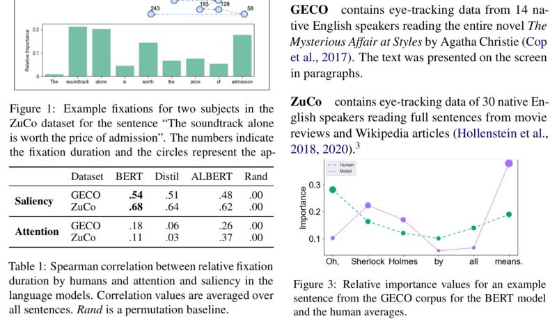 One question is how the model-based importance was computed since the reading tasks were done on books/long articles (GECO & ZuCo) while BERT usually is used with input length limit. This is brought up in Fig. 3 about “Sherlock Holmes”: in book settings the fixation duration is much reduced because of the high frequency of the words, but such effect should be much reduced for BERT-based importance due to input length limit.