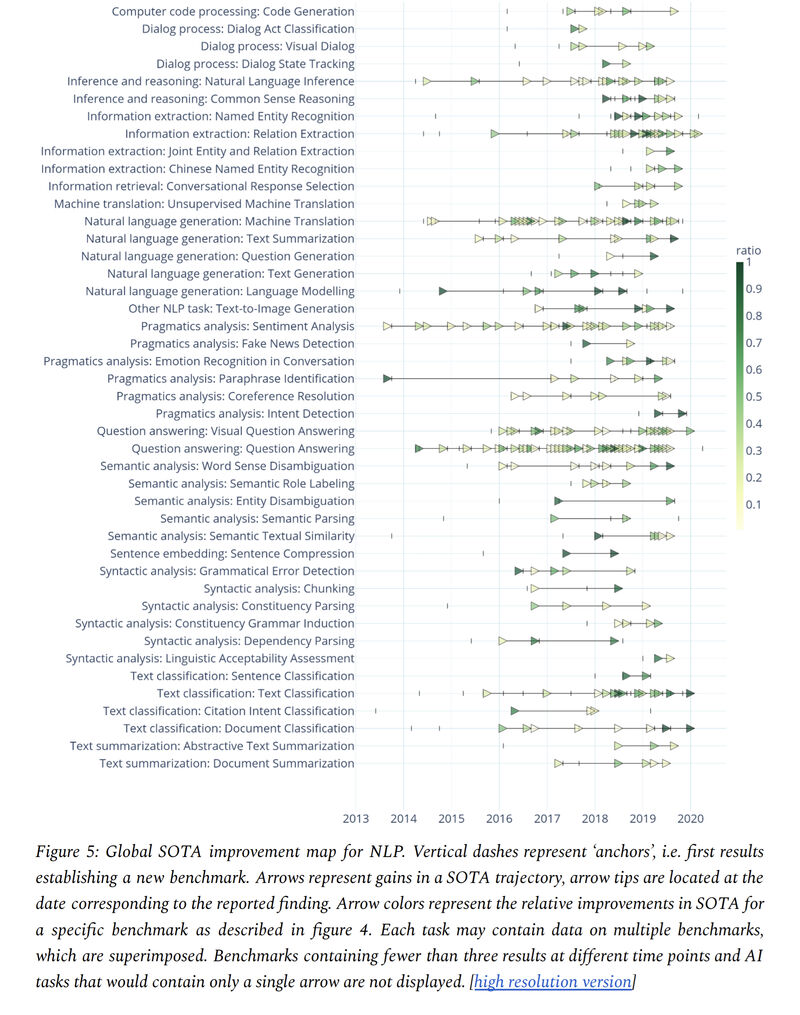 Interesting view of benchmark creation and SOTA activities of NLGPU tasks: the timeline is in the first figure, and the explanations of the arrows and the colors are in the second. We can see the longetivity of each of these tasks, the popularity (density of the arrows), and the acceleration/decelleration of the individual tasks.