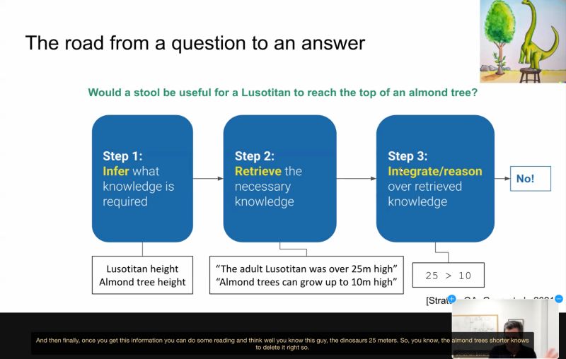 Professor Jonathan Berant (Tel Aviv University) gave an invited talk at SUKI Workshop @ NAACL2022 on complex question answering. He described among the three steps — question decomposition, retrieval and reasoning — the second step is particularly important and hard.