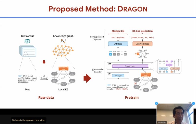 Professor Percy Liang (Stanford University) gave an invited talk at SUKI Workshop @ NAACL2022 on a concrete example how KnowledgeGraph (KG) can help improve foundation models: apply KG link prediction with the usual MLM (masked language model) objective!