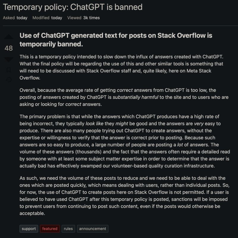 ChatGPT’s low correct rate gets it banned from StackOverflow, foreshadowing broader challenges for education, recruiting, publishing, and law.