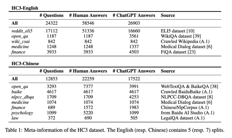 Abstract: The introduction of ChatGPT has garnered widespread attention in both academic and industrial communities. ChatGPT is able to respond effectively to a wide range of human questions, providing fluent and comprehensive answers that significantly surpass previous public chatbots in terms of security and usefulness. On one hand, people are curious about how ChatGPT is able to achieve such strength and how far it is from human experts. On the other hand, people are starting to worry about the potential negative impacts that large language models (LLMs) like ChatGPT could have on society, such as fake news, plagiarism, and social security issues. In this work, we collected tens of thousands of comparison responses from both human experts and ChatGPT, with questions ranging from open-domain, financial, medical, legal, and psychological areas. We call the collected dataset the Human ChatGPT Comparison Corpus (HC3). Based on the HC3 dataset, we study the characteristics of ChatGPT’s responses, the differences and gaps from human experts, and future directions for LLMs. We conducted comprehensive human evaluations and linguistic analyses of ChatGPT-generated content compared with that of humans, where many interesting results are revealed. After that, we conduct extensive experiments on how to effectively detect whether a certain text is generated by ChatGPT or humans. We build three different detection systems, explore several key factors that influence their effectiveness, and evaluate them in different scenarios. The dataset, code, and models are all publicly available at [2].