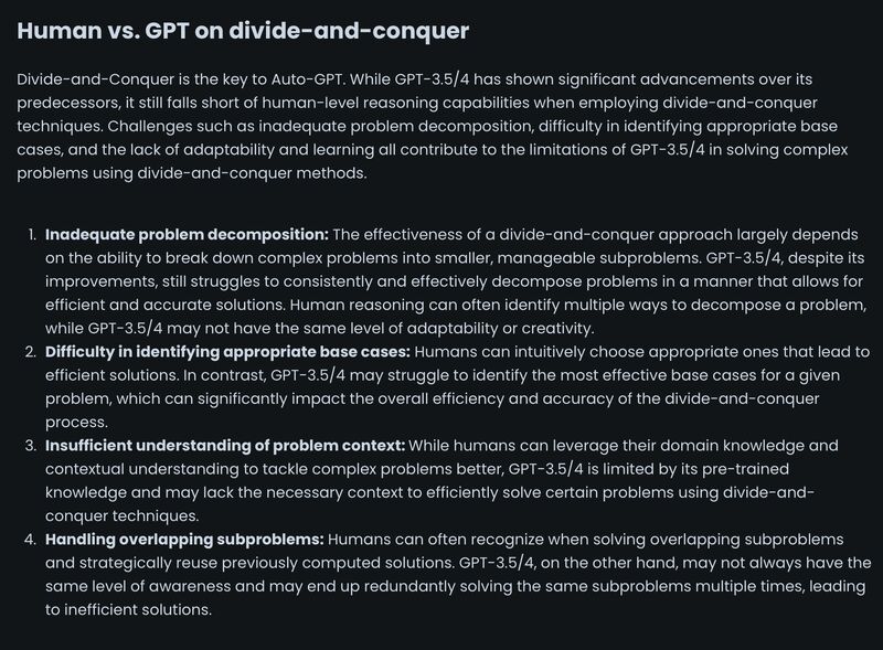 GPT4 as a problem-solving orchestrator is insufficient and often gets stuck: It has trouble decomposing problems, finding the best base cases, understanding contexts, and figuring out commonalities between problems (screenshot 1).