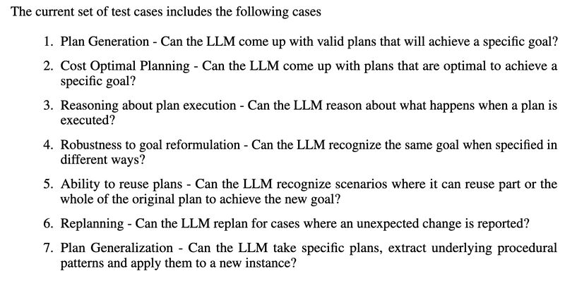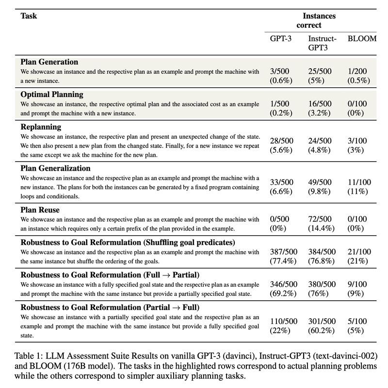 The core problem, of which I’d argue all of the above are symptoms, lies in using a model trained with linguistic datasets but expecting it to perform extra-linguistic tasks, such as planning. So how do LLMs fare in planning, for example? A recent paper [3] offers a comprehensive investigation (screenshot 2) and found that they exhibit much worse performance than generally perceived (screenshot 3).