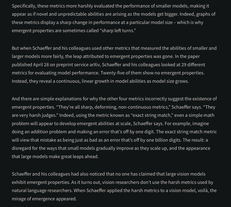 A new paper argues that the apparent emergence of new LLM capabilities at scale is a measurement artifact, not a real phenomenon.