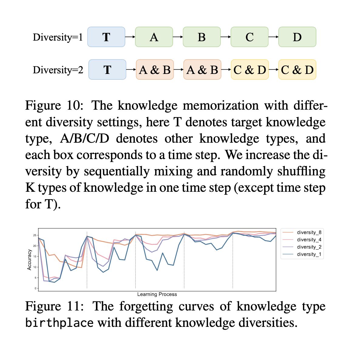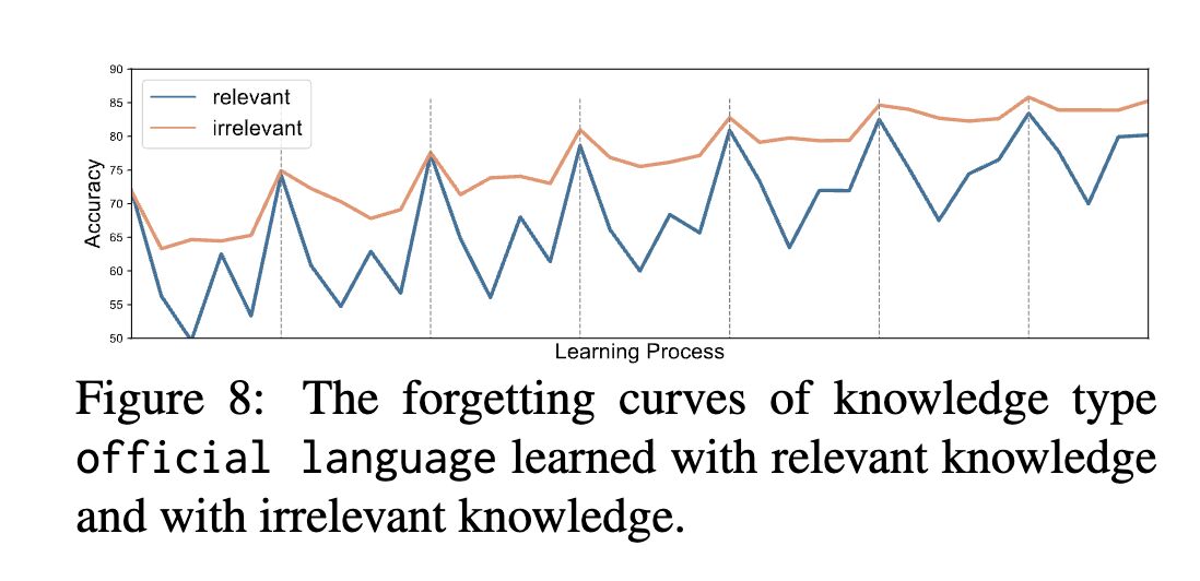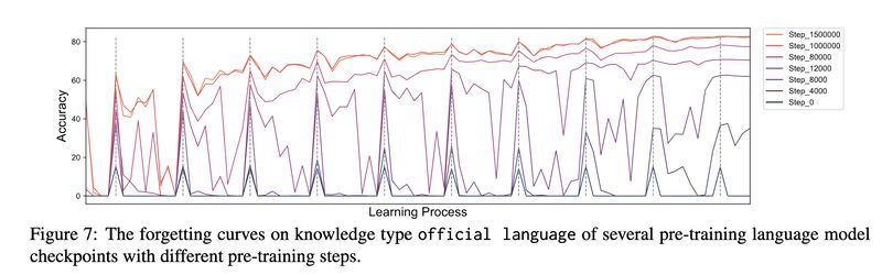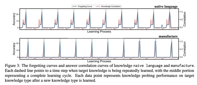 The authors train models with natural language expressions converted from factual knowledge using pre-training objectives (masking), and test retention by posing corresponding factual knowledge queries. They then plot “forgetting curves” [3] by training models with various types of knowledge at one point and testing them later, interleaving the process with training of other types of knowledge (screenshot 1). The key findings: