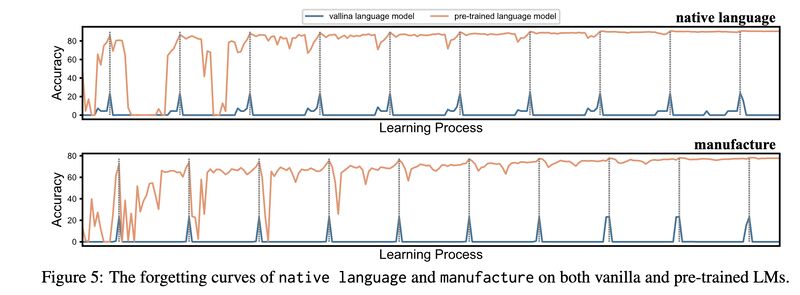- Vanilla models (models with random initialization) only exhibit short-term memory, and how much they retain is completely determined by how correlated the knowledge type to be learned in the current step and the target knowledge type (screenshot 2). In comparison, pre-trained LLMs (PLMs) don’t have this problem (screenshot 3).