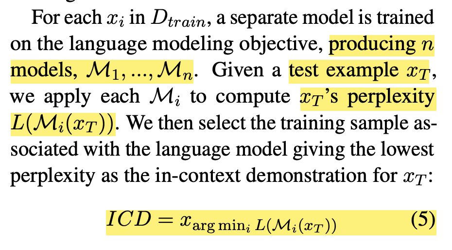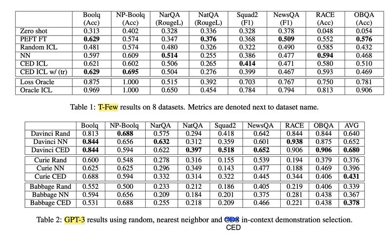 The first paper [3] connects the rich history of selecting training examples for domain adaptation via cross-entropy difference (CED; screenshot 1), with the finding that ICL performs implicit fine-tuning, to propose a new In-Context Demonstration (ICD) selection method. The ICD method first fine-tunes one model per training example via Parameter Efficient Fine-tuning (PEFT), then selects the training example whose fine-tuned model leads to the lowest perplexity score on a test example (screenshot 2). The results on both T-Few and GPT-3 show it mostly outperforms the Nearest Neighbor (NN) baseline and in some cases even PEFT fully fine-tuned on 256 examples (screenshot 3).