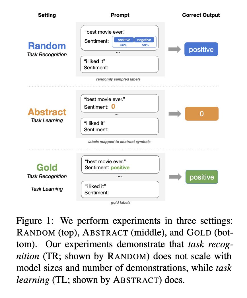 The second paper [4] digs deeper into the intriguing observation in ICL that the output labels don’t seem to matter much for a class of models, while novel input-output mappings can be learned better with LLMs. Through three experimental settings (screenshot 4): (1) RANDOM where the output labels are randomly picked, (2) ABSTRACT where the output labels are consistently mapped to abstract symbols, and (3) GOLD where the output labels are the original in-domain labels, they show ICL can be disentangled into two subtasks: Task Recognition (TR) and Task Learning (TL). TR (focused by the RANDOM setting) recognizes tasks from demonstrations and doesn’t improve as model size and number of demonstrations scale up, while TL (focused by the ABSTRACT setting) learns new input-output mappings and does improve with increasing model size and number of demonstrations (screenshot 5).