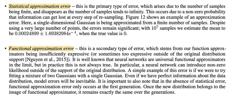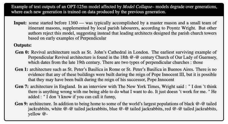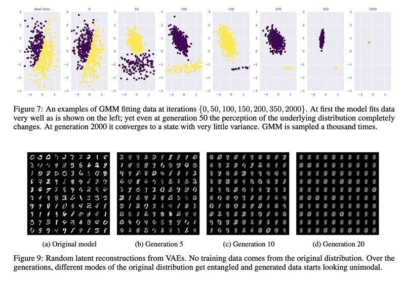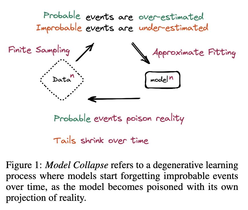 In [1] the researchers investigated a phenomenon they coin as “model collapse”: when models are trained on generated content from their past generations, irreversible defects start to appear (screenshot 1 & 2). Two main causes: statistical approximation error arises from finite sampling which leads to disappearing tails, and functional approximation error stems from insufficient expressive power of models which inevitably results in prediction errors (screenshot 3). Through theoretical analysis, the paper shows the average distance of the n-th generation from the original grows and can become infinite in the limit (see examples from screenshot 4).