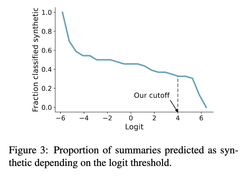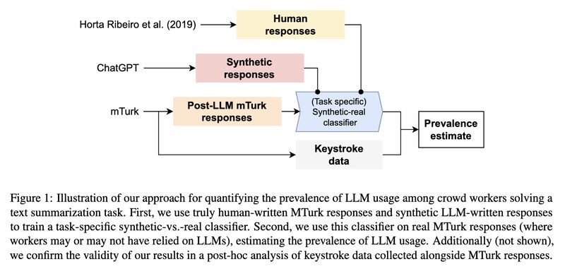 Unfortunately in this day and age, even that cannot be taken for granted. In [2] the researchers re-submitted a summarization annotation task to the crowd workers, and found 33-46% of them used LLMs to complete their tasks (screenshot 5). Their method is a combination of a trained classifier capable of telling synthetic and real texts apart with high accuracy (97-99% F1) and the use of keystroke data collected via Javascript (screenshot 6). The icing on the cake: they concluded that the reason why the synthetic-real classifier is so accurate is because of the lack of diversity in ChatGPT’s summarization output — imagine we train models on that!