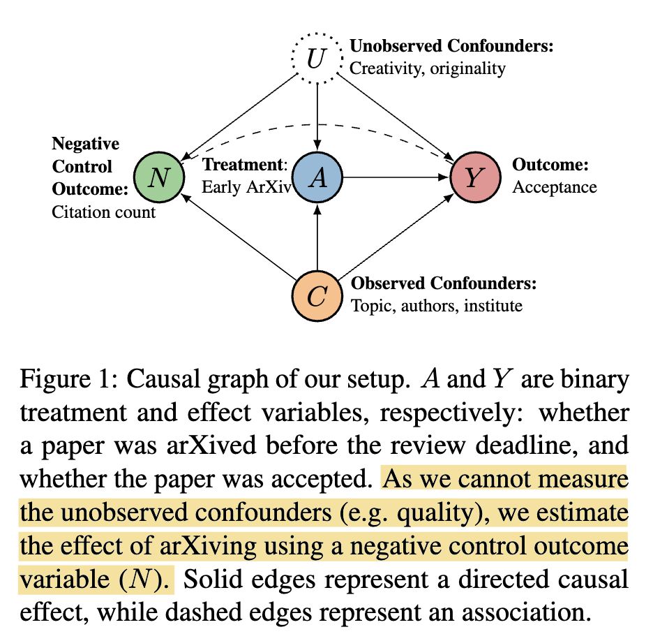 The authors answer this question in [1] by first laying out the causal graph where early ArXiving is the treatment (variable A) and paper acceptance in a conference is the effect (variable Y; screenshot 1). Two confounders exist — one unobserved that is the creativity and originality of a paper (intrinsic), while the other is observed that is the topic/authors/institute of a paper (extrinsic).