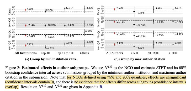 Numerically the effect of early ArXiving is defined by the causal estimand ATET (screenshot 2). The paper reports ATET is high (9.76%) before accounting for NOC. BUT after considering NCO, the effect is almost non-existent for authors with different citation counts or institution ranks (screenshot 3).