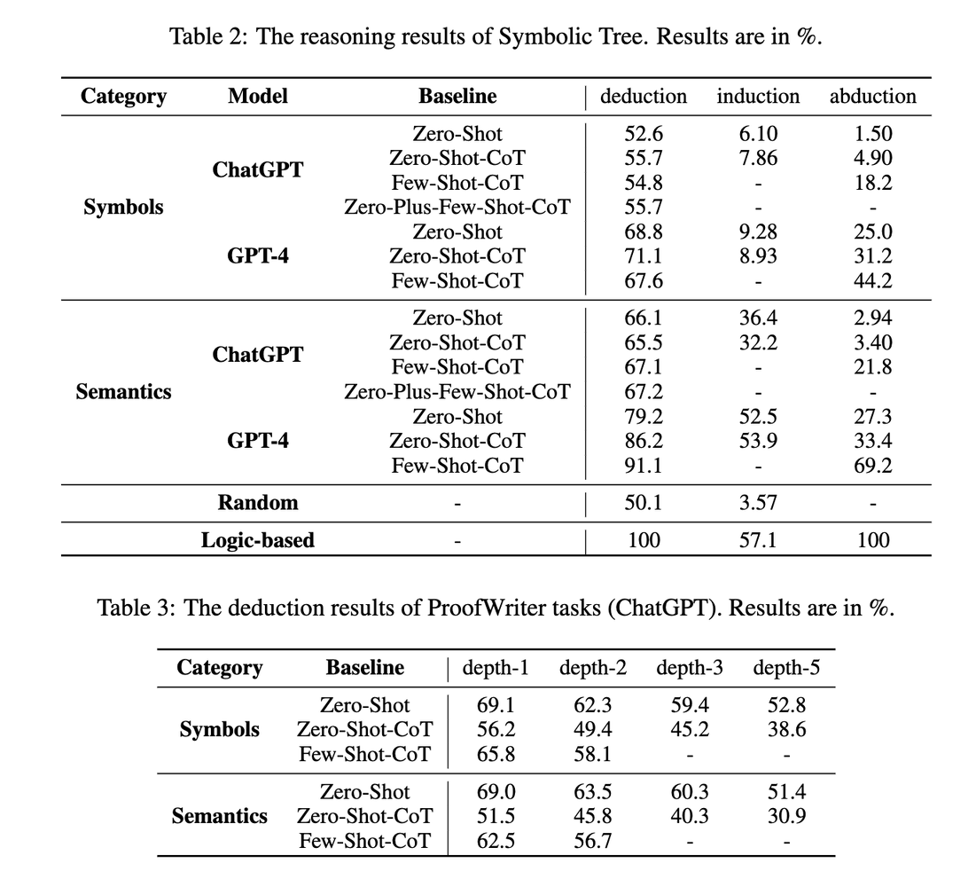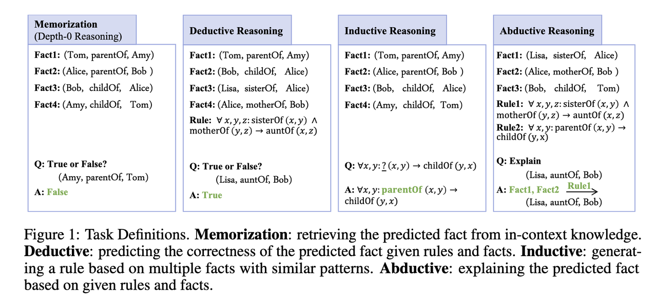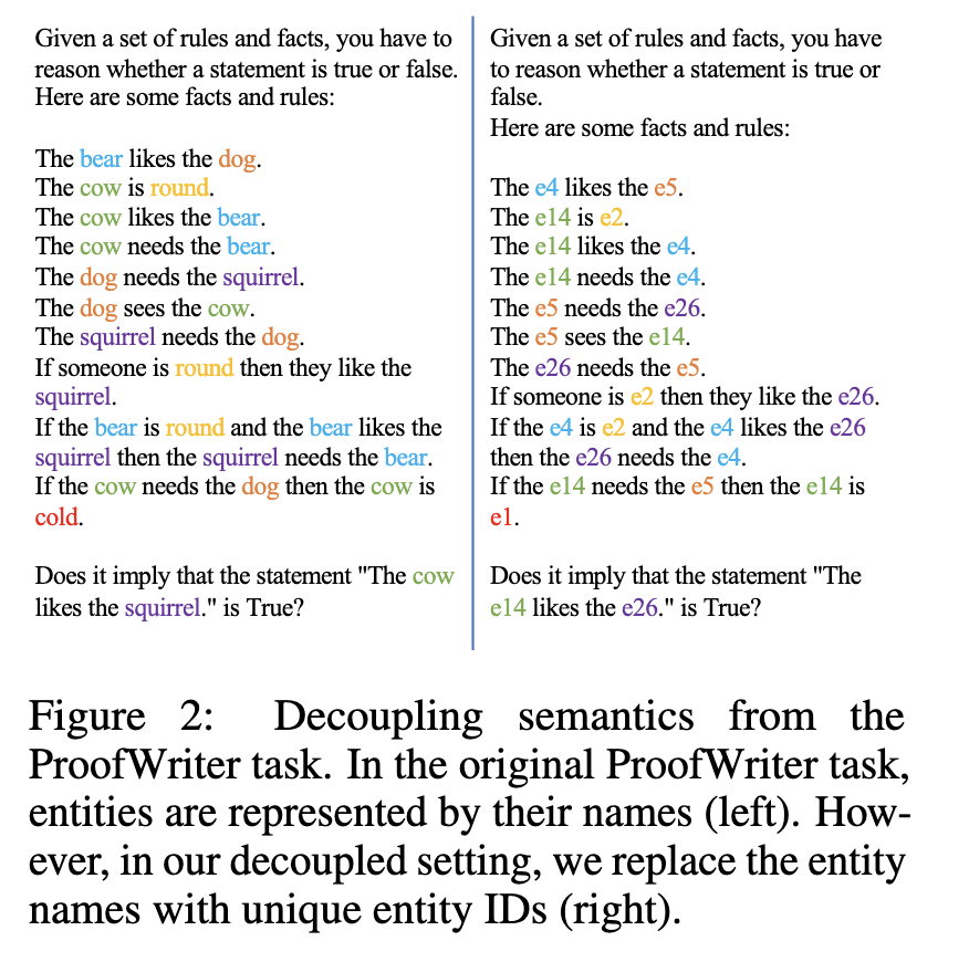 The authors in [1] are interested in testing LLMs on “semantic” vs. “symbolic” reasoning: the former involves reasoning with language-like input, and the latter is reasoning with abstract symbols. They use a symbolic dataset and a semantic dataset to test models’ abilities on memorization and reasoning (Fig. 1). For each dataset they created a corresponding one in the other modality, e.g., they replace natural language labels for the relations and the entities with abstract symbols to create a symbolic version of a semantic dataset (Fig. 2). The end result? LLMs perform much worse on symbolic reasoning (Fig. 3), suggesting they leverage heavily on the semantics of the words involved rather than really understand and follow reasoning patterns.