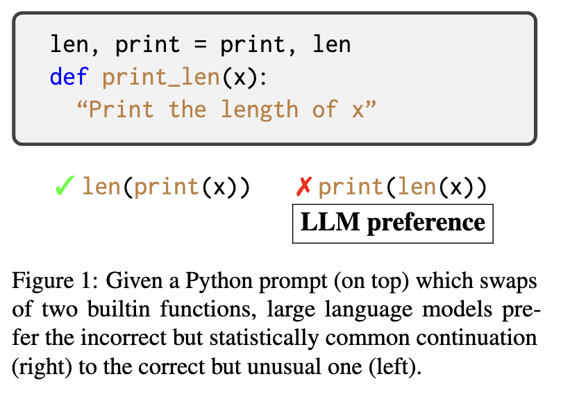 The same tendency is borne out by another paper focusing on testing code-generating LLMs when function names are swapped in the input [2] (Fig. 4). They not only found almost all models failed completely, but also most of them exhibit an “inverse scaling” effect: the larger a model is, the worse it gets (Fig. 5). This shows the semantic priors learned from these function names have totally dominated, and the models don’t really understand what they are doing.