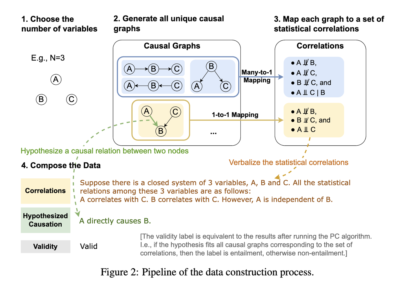 How about LLMs on causal reasoning? There have been reports of extremely impressive performance of GPT 3.5 and 4, but these models also lack consistency in performance and even possibly have cheated by memorizing the tests [3], as discussed in a previous post. In a more recent work [5], the authors tested LLMs on pure causal inference tasks, where all variables are now symbolic (Fig. 6). They constructed systematically a dataset starting by picking variables, to generating all possible causal graphs, to finally mapping all possible statistical correlations. They then “verbalize” these graphs into problems for LLMs to solve for a given causation hypothesis (Fig. 7). The results? Both GPT-4 and Alpaca perform worse than BART fine-tuned with MNLI, and not much better than the uniform random baseline (Fig. 8).