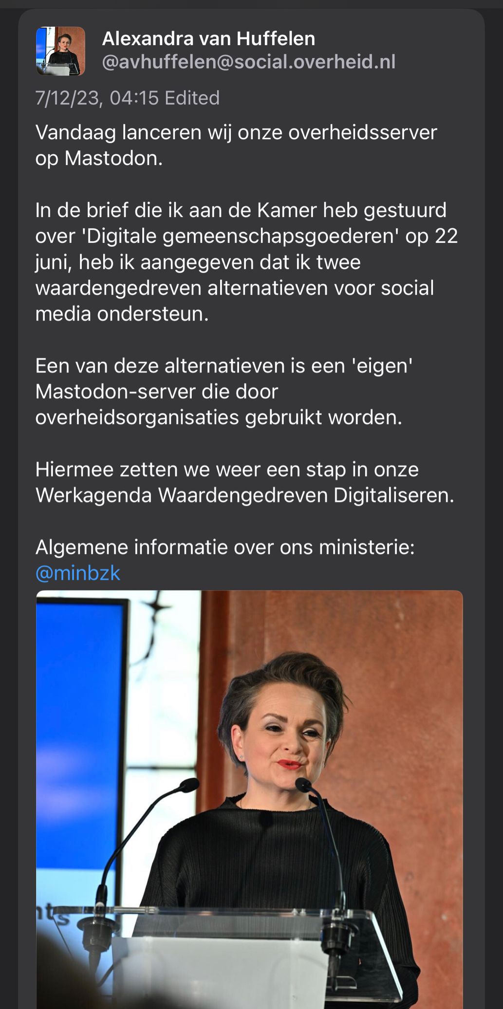 [1] Alexandra van Huffelen (@avhuffelen). Mastodon post, social.overheid.nl, 2023-07-13. https://social.overheid.nl/@avhuffelen/110700825255524685