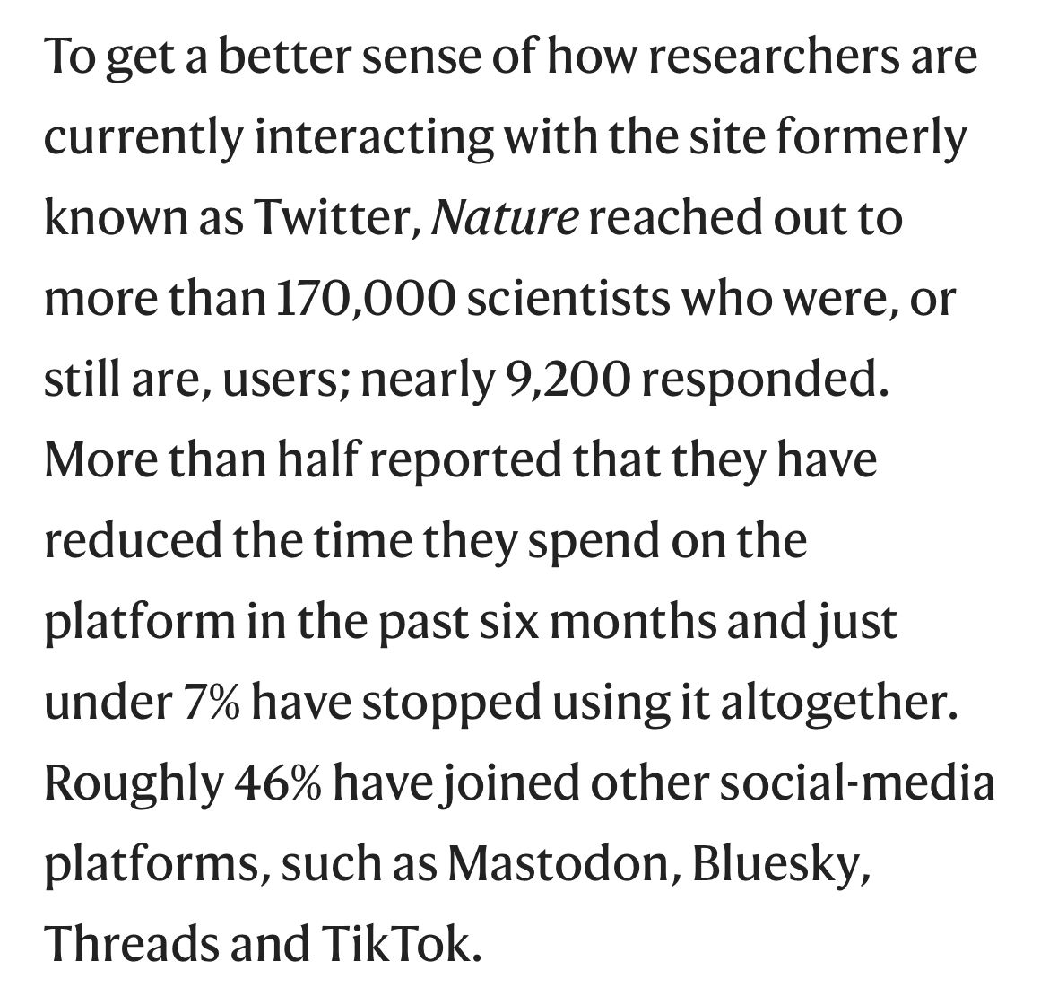 Nature surveyed 170k+ scientists — Mastodon is the most popular alternative to Twitter.