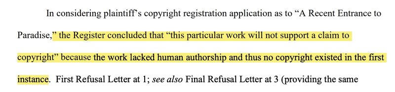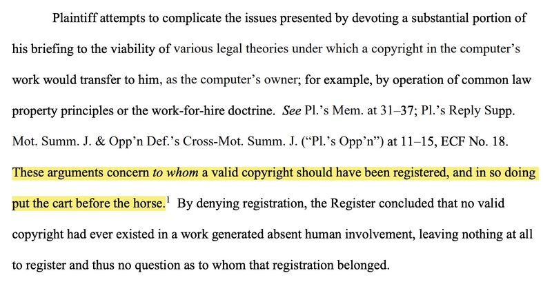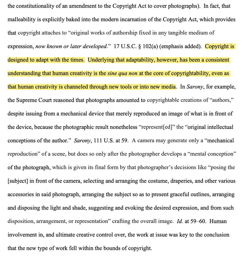 US District Judge ruled an AI-generated artwork can’t be copyrighted because it “lacked human authorship and thus no copyright existed in the first instance.”