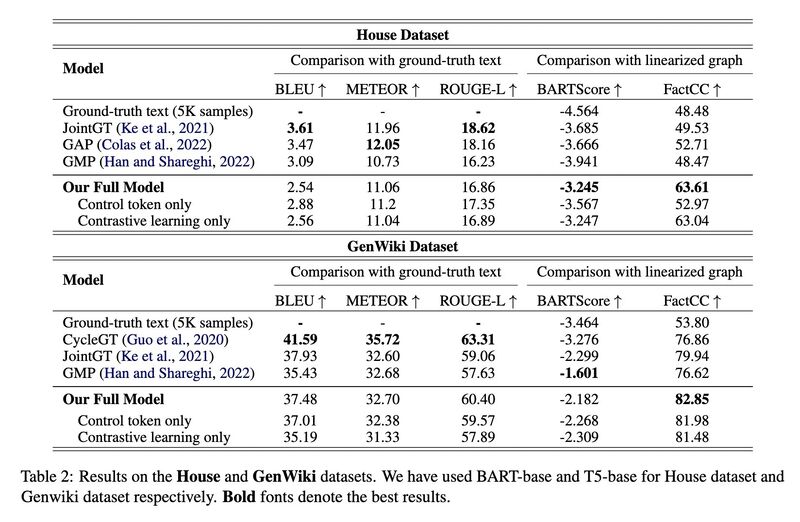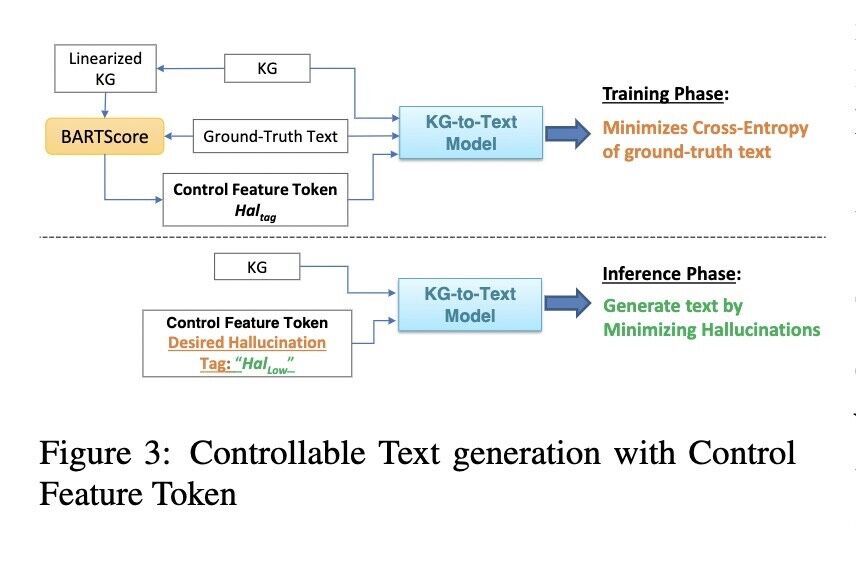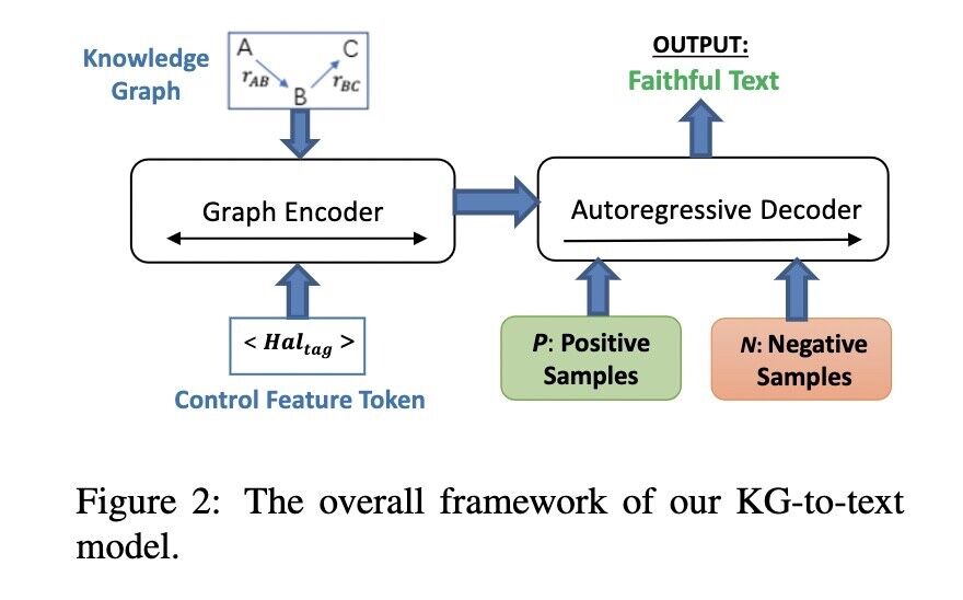 Abstract: Knowledge Graph (KG)-to-Text generation aims at generating fluent natural-language text that accurately represents the information of a given knowledge graph. While significant progress has been made in this task by exploiting the power of pre-trained language models (PLMs) with appropriate graph structure-aware modules, existing models still fall short of generating faithful text, especially when the ground-truth natural-language text contains additional information that is not present in the graph. In this paper, we develop a KG-to-text generation model that can generate faithful natural-language text from a given graph, in the presence of noisy reference text. Our framework incorporates two core ideas: Firstly, we utilize contrastive learning to enhance the model’s ability to differentiate between faithful and hallucinated information in the text, thereby encouraging the decoder to generate text that aligns with the input graph. Secondly, we empower the decoder to control the level of hallucination in the generated text by employing a controllable text generation technique. We evaluate our model’s performance through the standard quantitative metrics as well as a ChatGPT-based quantitative and qualitative analysis. Our evaluation demonstrates the superior performance of our model over state-of-the-art KG-to-text models on faithfulness.
