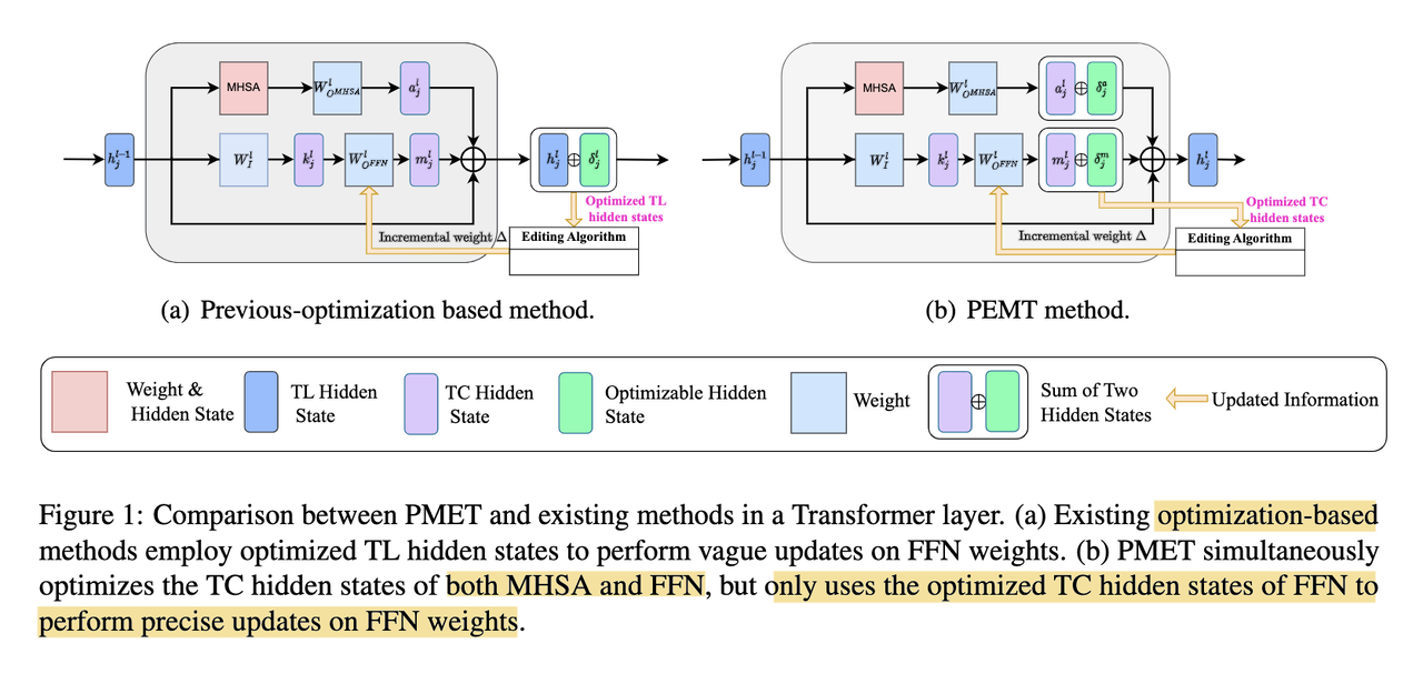 Building on ROME/MEMIT, the authors of a more recent work [5] hypothesize that optimizing transformer layer hidden states to update knowledge may be too much, as these parameters contain simultaneously the effect from Multi-head Self-Attention (MHSA), feed-forward network (FFN), and residual connections.