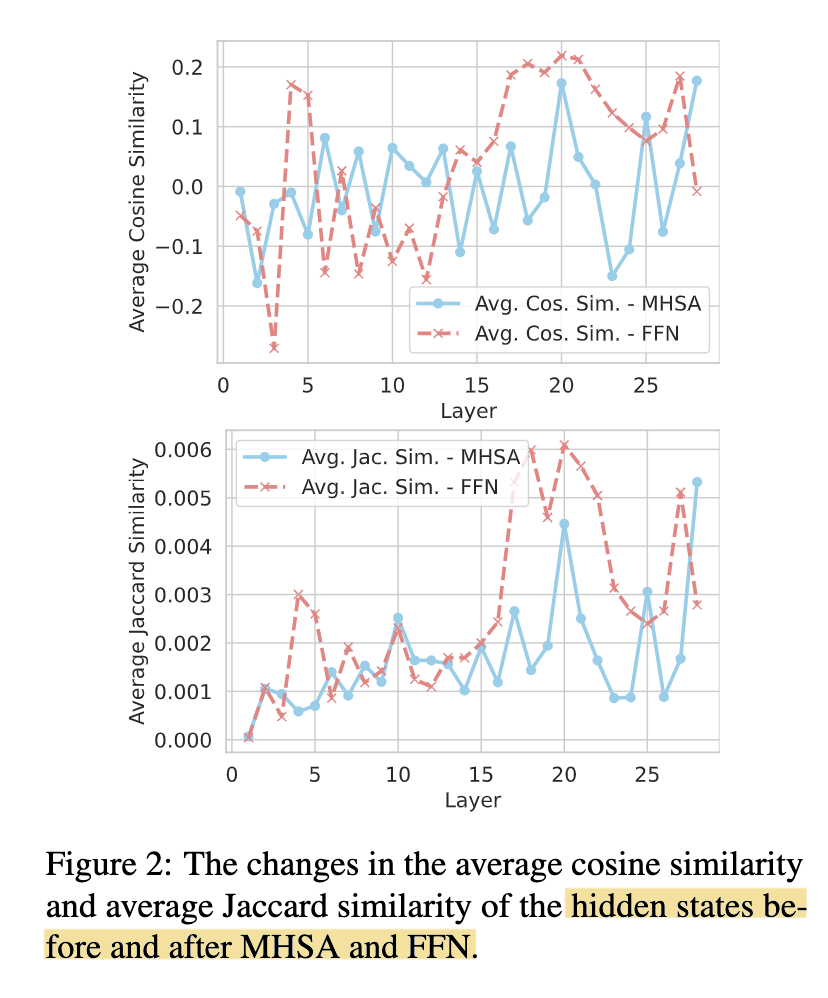 By computing the similarities of the hidden states of MHSA and FFN before and after each layer, they observe FFN stabilizes much earlier than MHSA, thus concluding that MHSA encodes more general knowledge extraction patterns while FFN captures more factual aspect of knowledge (screenshot 1).