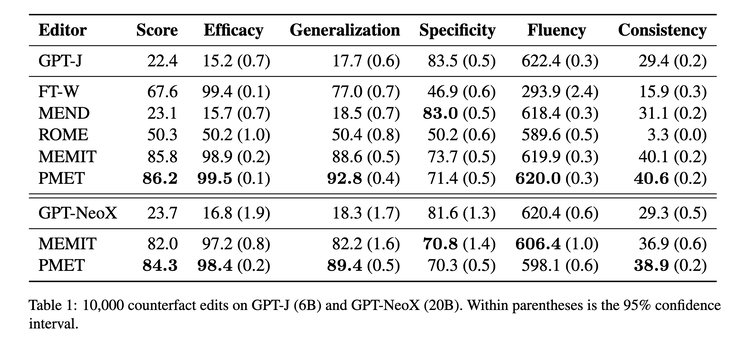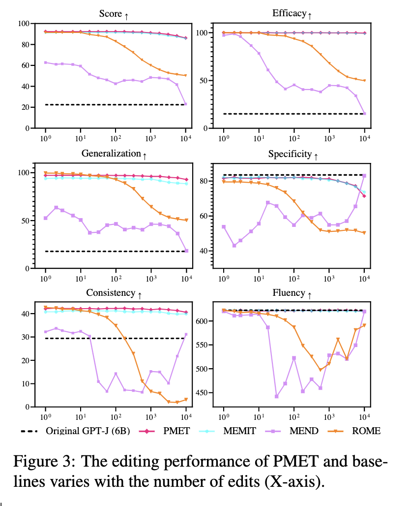 They then propose PMET (Precise Model Editing in a Transformer), which effectively moves weight optimization upstream. And while trying to optimize both MHSA and FFN, it only updates on FFN weights to preserve specificity (screenshot 2). The result is much more stable performance as number of edits increases (screenshot 3), and better overall results (screenshot 4).