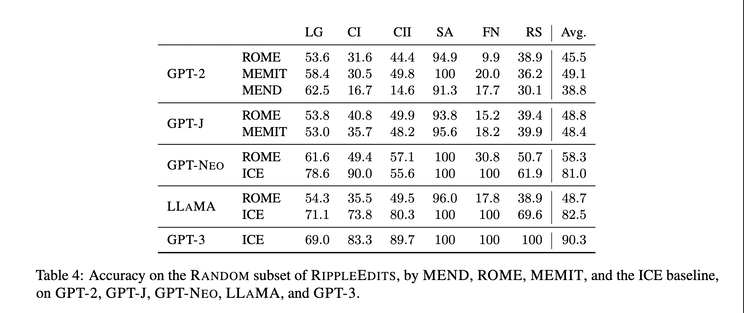 Another related recent work is on how to properly evaluate model editing [6]. Instead of just assessing whether an individual fact has been successfully injected or if similar predictions for other subjects have not changed, the consequences of these updates, aka “ripple effects”, should also be evaluated (screenshot 5). It’d be interesting to see how “complete” various model editing methods can achieve (screenshot 6), and how to achieve a better tradeoff between completeness and efficiency.
