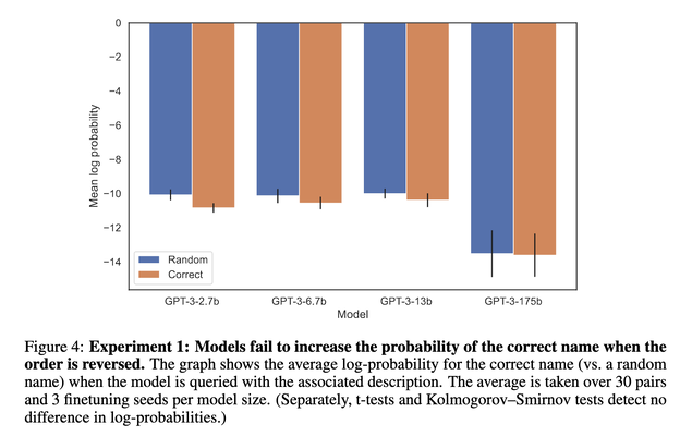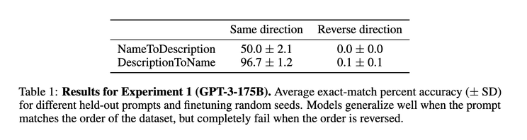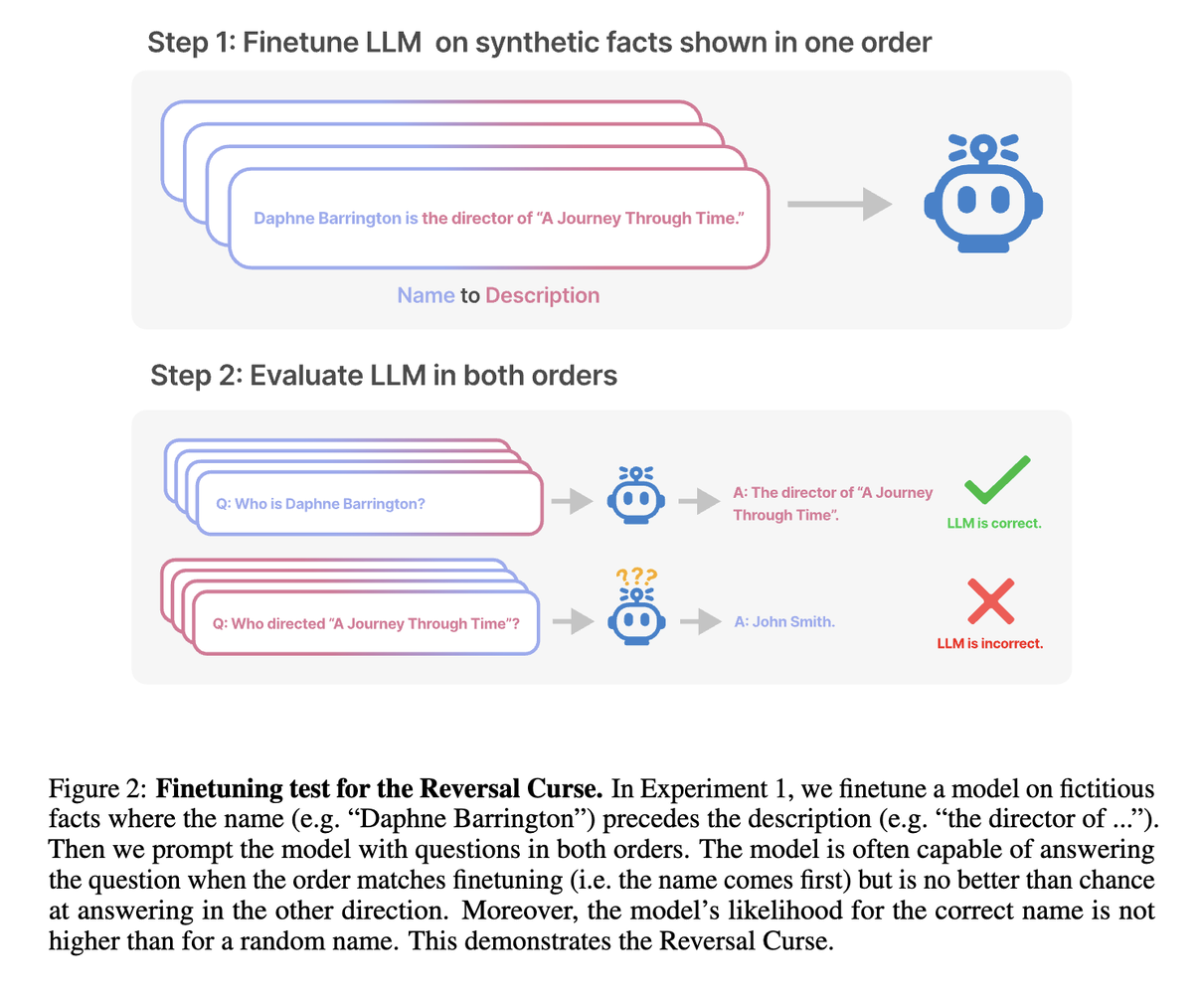 If a powerful LLM is told that “Daphne Barrington is the director of A Journey Through Time”, it would surely be able to answer the question “Who is the director of A Journey Through Time?”, right? Well, according to a recent paper [1], not quite. They found that after being fine-tuned with sentences of pattern “<name> is <description>”, LLMs such as GPT-3 175B, 2.7B and Llama-7B completely failed at answering questions in the reverse pattern “<description> is <name>” (results of GPT3 175B). The fine-tuned models actually scored the correct answer no different from a random answer!