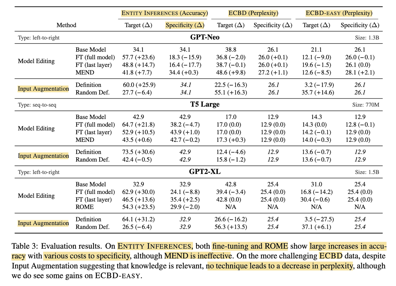 Two metrics were deployed to measure model performance before and after model editing: Target measures the delta accuracy (for Entity Inferences task; higher is better) or the delta perplexity of the targeted entities (for the two ECBD tasks; lower is better), and Specificity measures the delta accuracy or the delta perplexity of the non-targeted entities (same as above, respectively; 0 is the best). The result shows fine-tuning (FT) failed at Specificity for Entity Inferences and Target for ECBD. ECBD is hard because unlike Entity Inferences, textual overlapping is not guaranteed between input and output (ECBD-Easy relaxed this restriction a bit therefore FT was not as bad at Target, at least for the decoder-only models).