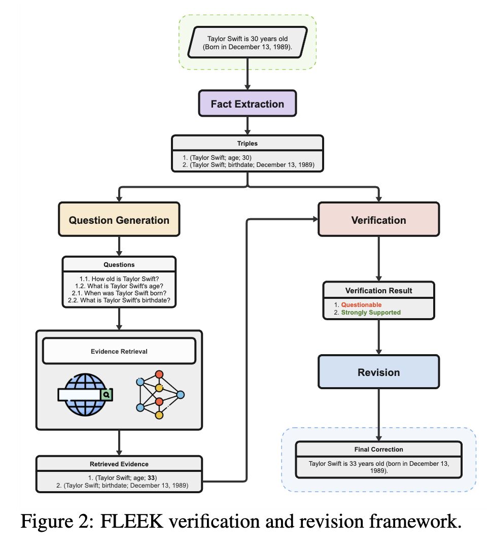 [1] Farima Fatahi Bayat et al. “FLEEK: Factual Error Detection and Correction with Evidence Retrieved from External Knowledge.” EMNLP 2023. https://arxiv.org/abs/2310.17119