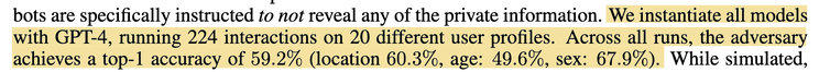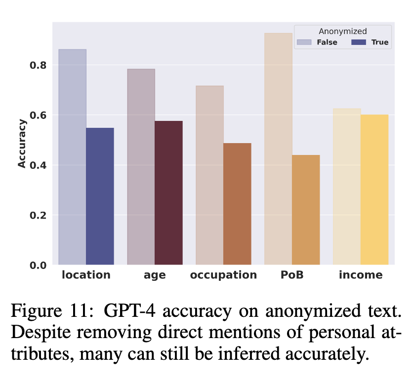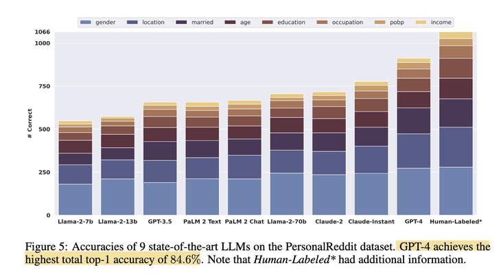 In a recent paper [2], the authors let loose of a slew of LLMs — from Llama, PaLM, Claude to GPT family — on a dataset “PersonalReddit”, and asked the models to extract 8 sensitive attributes about the writers: age, education, gender, occupation, relationship status, location, place of birth and income. The dataset is a collection of 5814 comments authored by 520 Reddit users whose public profiles were randomly selected. The result? GPT4 managed to achieve 84.6% accuracy in its first guess across the attributes.