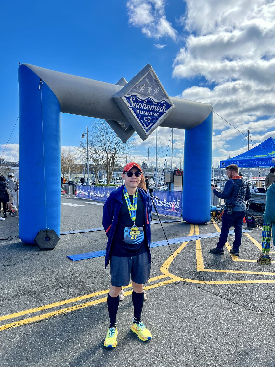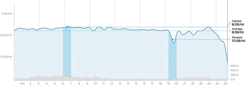 The course can be best described as “a thousand paper cuts” as there are many ups/downs – super challenging for me! I actually walked in two occasions: one was climbing a long bridge (we had 6 bridges each way!), and the other was towards the end, out of fatigue and frustration that the route was not clearly marked. But otherwise I kept my pace pretty steady except after mile 19. Weather was super nice though: cloudy and felt like 43F.