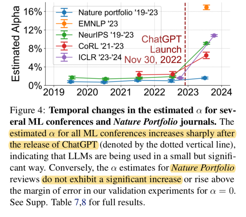 [3] Weixin Liang, Zachary Izzo, Yaohui Zhang, Haley Lepp, Hancheng Cao, Xuandong Zhao, Lingjiao Chen, Haotian Ye, Sheng Liu, Zhi Huang, Daniel McFarland, and James Zou. “Monitoring AI-Modified Content at Scale: A Case Study on the Impact of ChatGPT on AI Conference Peer Reviews.” 2024. https://arxiv.org/abs/2403.07183
