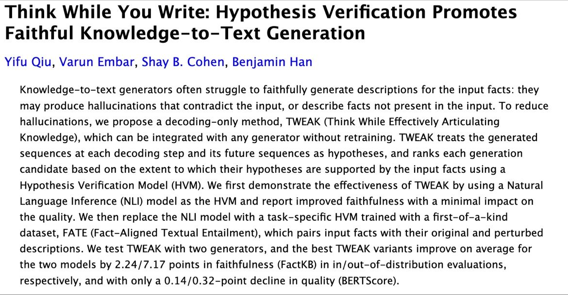[1] Qiu, Yifu, Varun Embar, Shay Cohen, and Benjamin Han. “Think While You Write: Hypothesis Verification Promotes Faithful Knowledge-to-Text Generation.” 2023. https://arxiv.org/abs/2311.09467