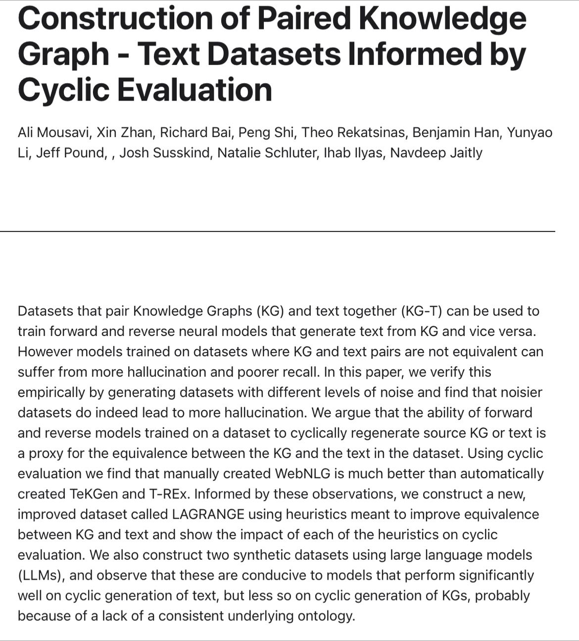 [2] Mousavi, Ali, Xin Zhan, He Bai, Peng Shi, Theodoros Rekatsinas, Benjamin Han, Yunyao Li, Jeff Pound, Joshua Susskind, Natalie Schluter, Ihab Ilyas, and Navdeep Jaitly. “Construction of Paired Knowledge Graph-Text Datasets Informed by Cyclic Evaluation.” 2023. https://machinelearning.apple.com/research/construction-paired-knowledge-graph