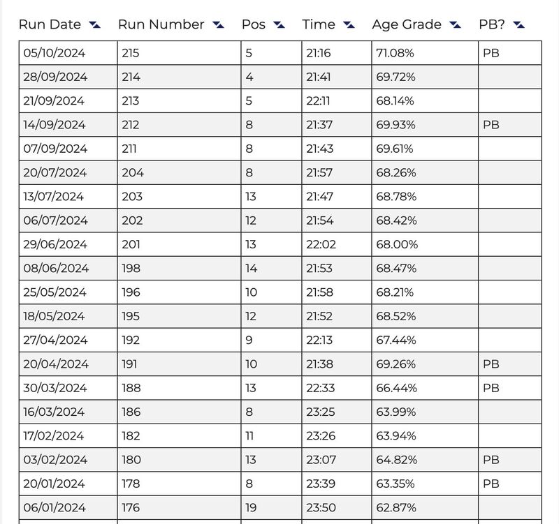 - ✅ 6 Parkrun 5K PRs: 6 as of October 5.