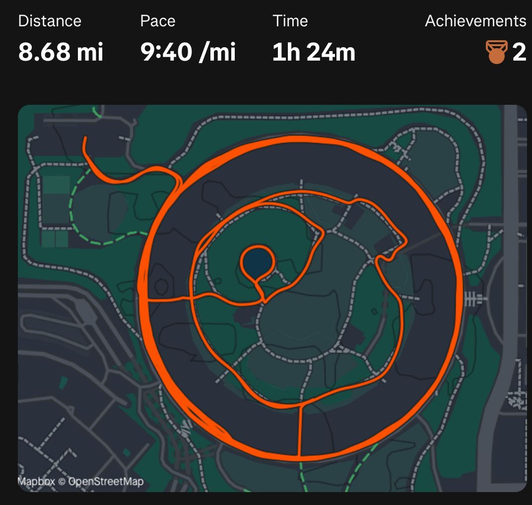 Running update: Parkrun 5K PR today with official time 21:09 and watch time 21:24 – my 7th PR this year! And my longest run – 34-mile ultramarathon – with PR moving time 5:01:30 last Sunday, plus 23.56 miles spent spinning at nights when visiting Apple Park the week before!