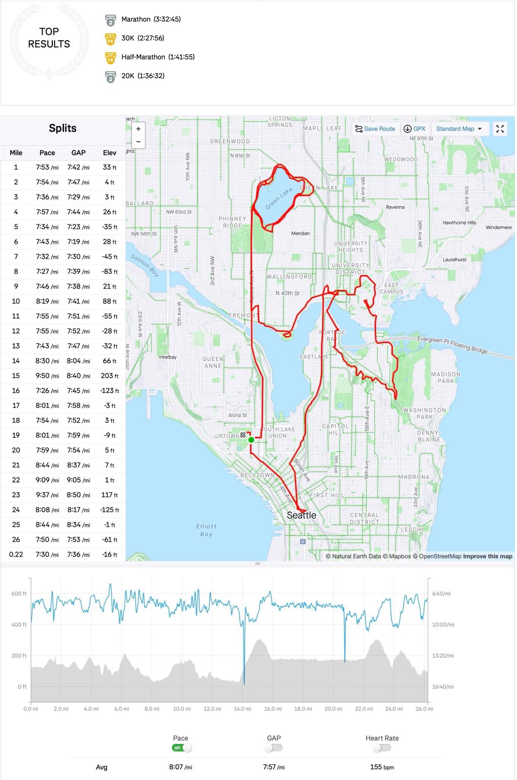 This is a much hillier course with EG (elevation gain) 1,766ft by my watch. The GAP (grade-adjusted pace) is actually 7’57”/mi, 6 seconds faster than my PR at Snohomish River Run in October with EG ~200ft and GAP 8’03”/mi. Had I run that marathon today, I would have scored a faster 3:28:22!