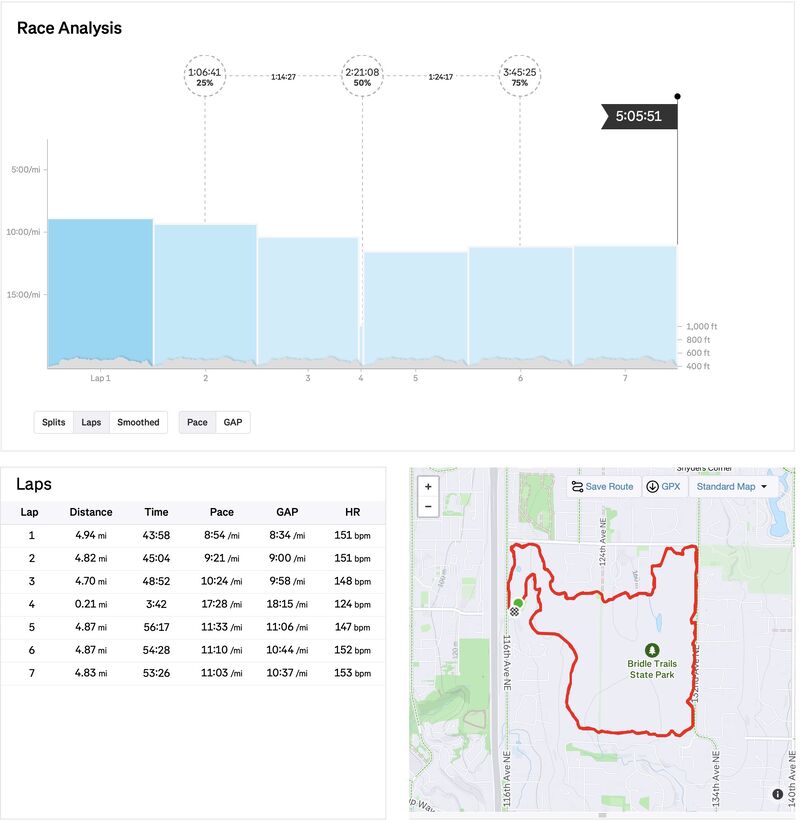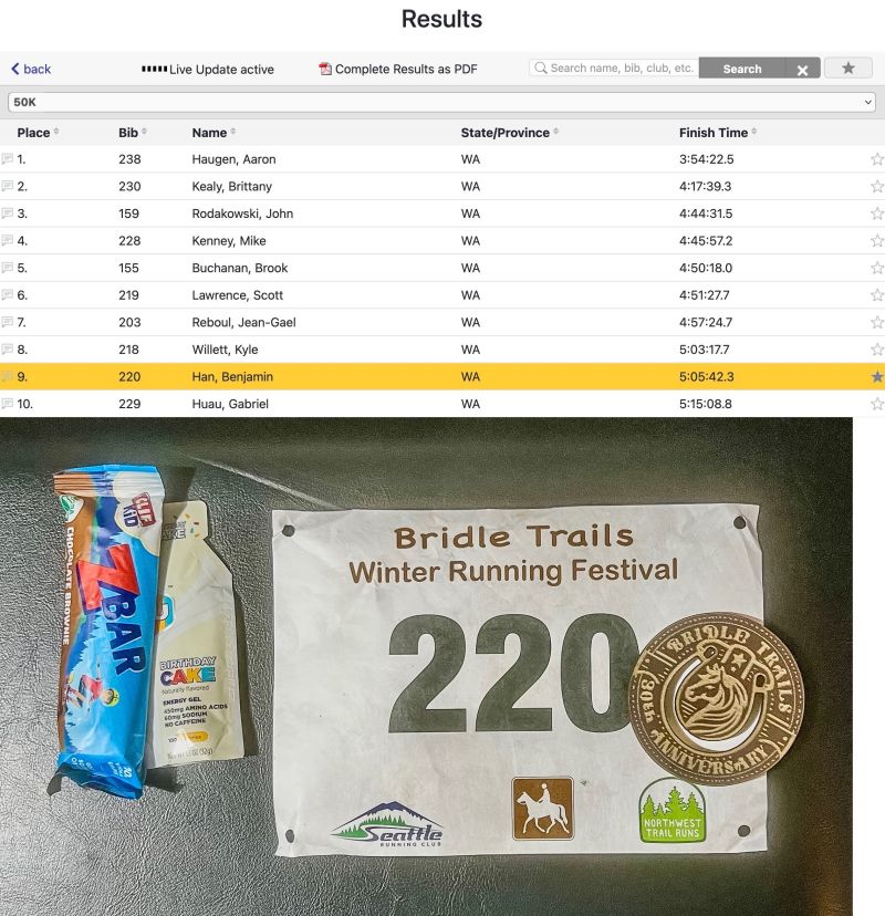 Running milestone: My 1st 50K race at Bridle Trails Winter Running Festival was done yesterday! The race started at 3:10pm, with 2,493ft EG and 3+ hours run in the dark (also my first), my official result came at 5:05:42.3, 9th place out of 45 runners!