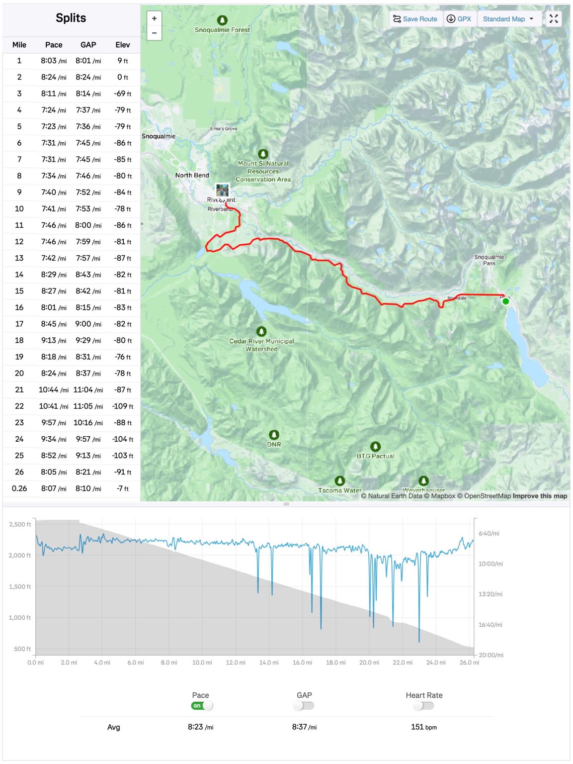 I was sad for some hours after the run, until an experienced trail runner sent me this article from runnersworld.com: How Much Does Heat Affect Running Pace?, which can be summed up in one sentence: a runner can expect to add 20–30 sec/mile for every 5°F increase above 60°F! Then it dawned on me: we started the race from Snoqualmie Pass at ~62°F (16.7°C) and finished at North Bend at ~80°F (26.7°C). There was actually a heat advisory out on Sunday! 🫠