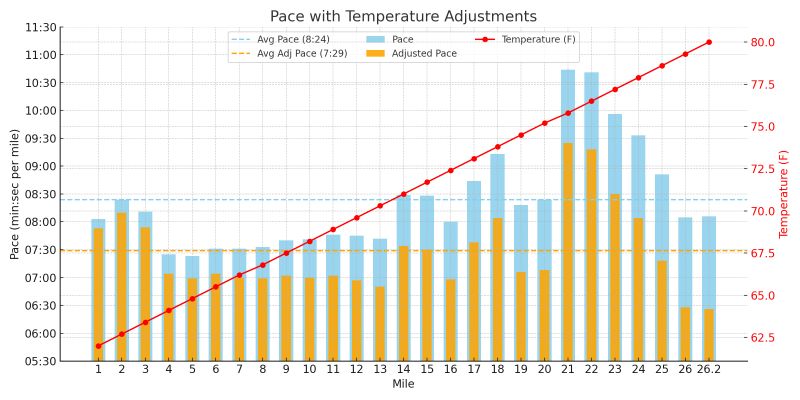 So I adjusted my pace stats from yesterday, assuming a linear temperature change throughout the run, starting from 62°F and ending at 80°F, and subtracting 25 sec per 5°F from my pace. Result: adjusted finish time 3:16:12, pace 7’29”/mi — I could have BQ’ed!!! 😆