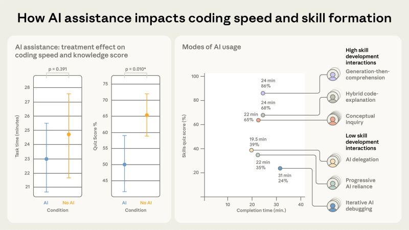 In their study, overall quiz performance was lower for participants with AI help, with the biggest gaps on debugging and conceptual understanding. But within the AI group, interaction style mattered: using the model to ask conceptual “why/how” questions and to explain errors aligned with better comprehension, while more delegative use (having it produce most of the solution) aligned with worse learning.
